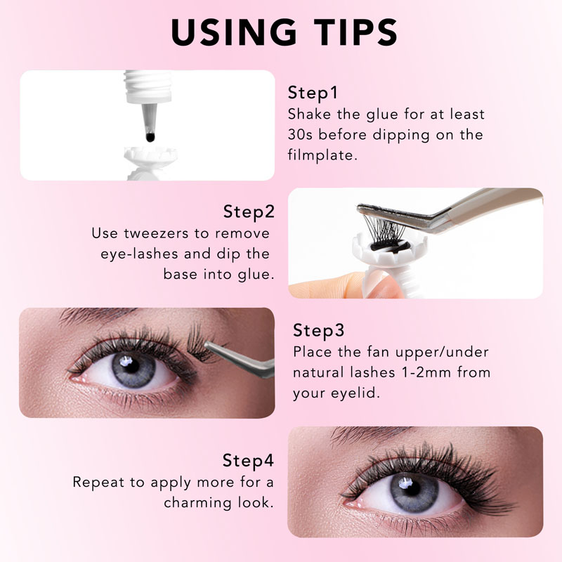 روند درخواست سریع و آسان است. با انتخاب خوشه های شلاق مورد نظر و قرار دادن آنها روی یک سطح صاف شروع کنید. سپس مقدار کمی از چسب خوشه DIY Lash ما را در پایه هر خوشه بمالید. اجازه دهید چسب خوشه ای DIY برای چند ثانیه خشک شود و سپس خوشه ها را به آرامی روی مژه های طبیعی خود فشار دهید.